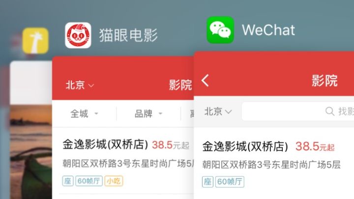 (图为猫眼 App 与小程序,因为长得像…感觉不小心给老东家竞争对手打广告了?)